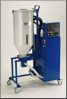 | Bei der Modellreihe MD wird der Trichter, wahlweise auch mehrere, und die entsprechend erforderliche Trockeneinheit auf ein fahrbares Gestell montiert. Hinzu kommt noch ein Vakuum-Fördersystem Typ CLS, welches das Granulat mit der getrockneten Luft transportiert. Das ist sehr wichtig, weil häufig durch Einsatz falscher Fördergeräte oder gar manueller Granulatentnahme aus dem Trichter dem Granulat wieder schlagartig Feuchtigkeit aus der Umgebungsluft zugesetzt wird. Auf die Kunststoffverarbeitungsmaschine kommt lediglich ein Granulatabscheider (Zyklon), der bei Bedarf Material aus dem Trockner anfordert. Diese mobile Trockeneinheit kann in wenigen Minuten an einen anderen Einsatzort geschoben werden. |